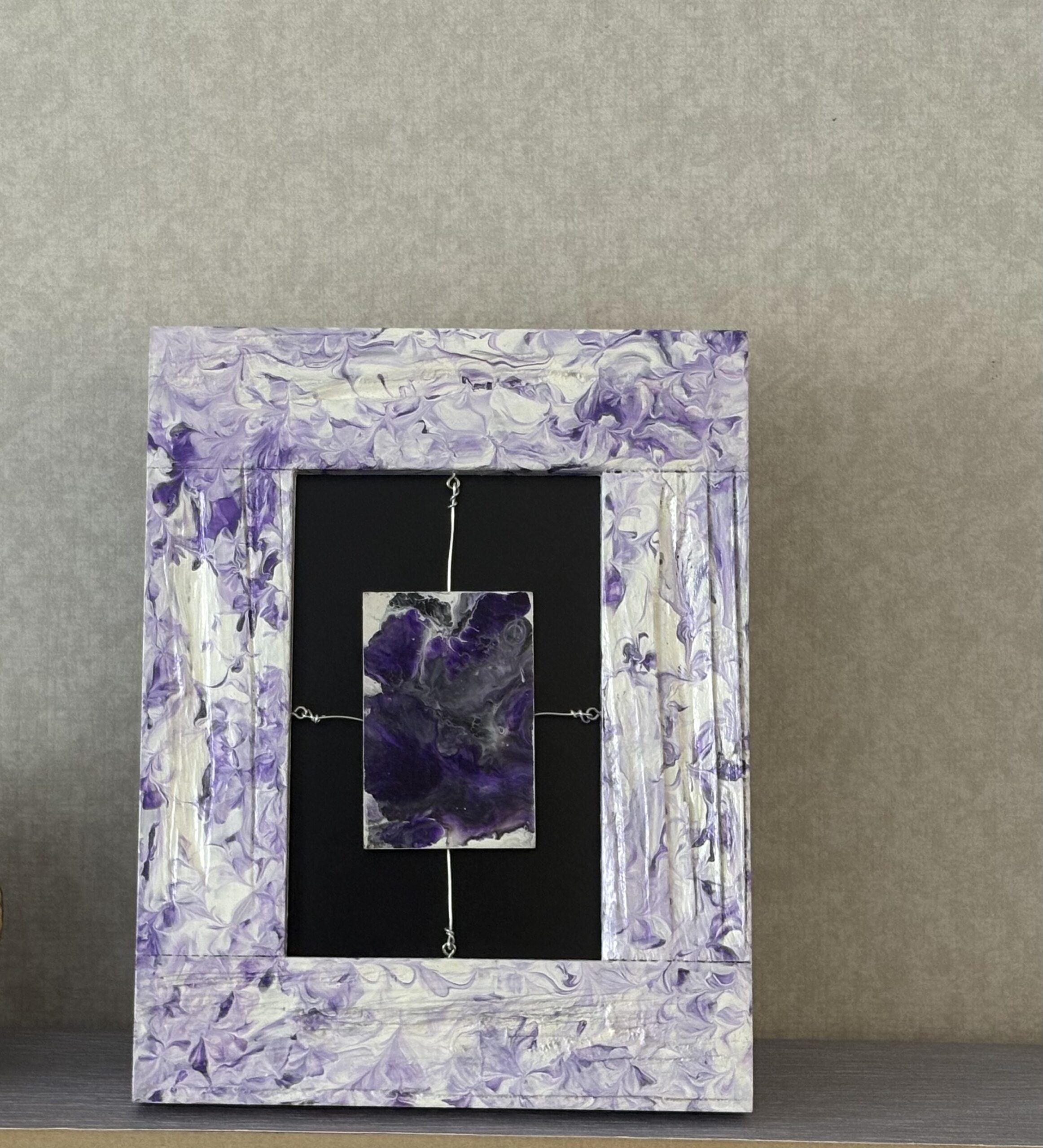 Unique framed artwork. Pale Purple and white photo frame with acrylic pour little world.